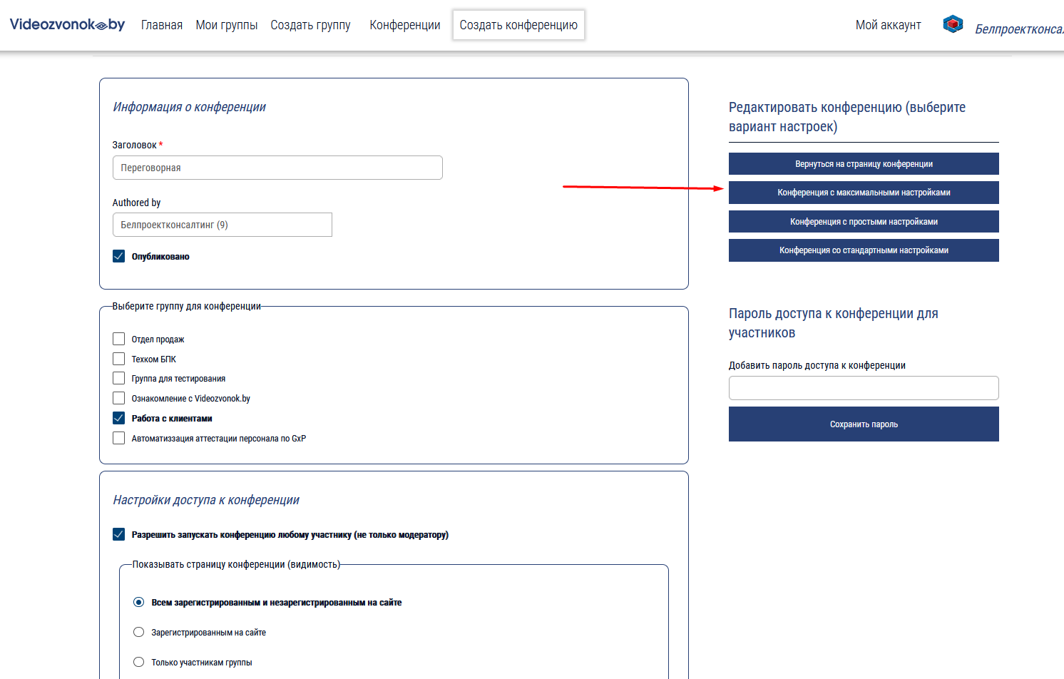 Для включения этой функции при создании или редактировании конференции необходимо выбрать форму  "Конференция с максимальными настройками":