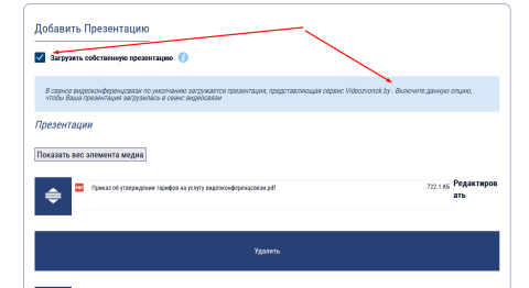 При создании и редактировании конференции её администраторы теперь могут добавлять свои презентации, которые автоматически загружаются при запуске сеанса видеоконференцсвязи. При этом загружаемая со страницы конференции презентация автоматически замещает собой стандартную презентацию , представляющую сервис Videozvonok.by . Такая функция предустановки презентаций может быть полезна, когда нужно без заминок провести обучение или ознакомить участников конференции с документами, предварительно подготовив весь массив необходимой информации. Или, например, когда пользователям конференции разрешено запускать ее без модератора. В этом случае участники, планирующие свое участие в онлайн-мероприятии, могут ознакомиться с его описанием на титульном листе презентации. -